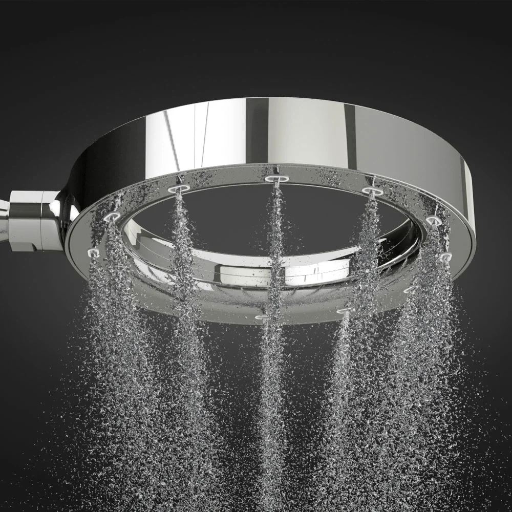 As soon as the water starts running, a large volume of air is pulled though the inner circle of the shower head, pushing the spray of water more quickly towards the user. This increased spray force results in a sensational showering experience.