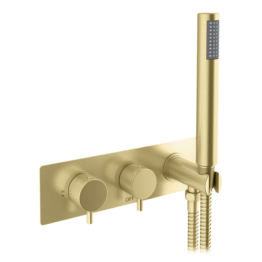 The striking Arezzo brushed brass modern concealed thermostatic control shower valve comes equipped with a convenient shower handset. The smart thermostatic shower valve ensures your water remains at a safe temperature. Featuring minimalist round handles, this modern style shower valve is ideal for a concealed installation. It diverts between two shower accessories.