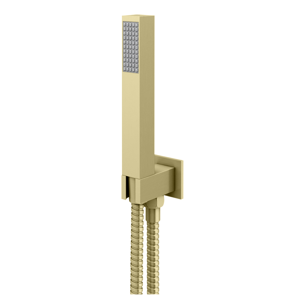 This modern square outlet elbow, finished in brushed brass, comes with a parking bracket, a flexible shower hose, and a sleek rectangular handset, providing the ideal finishing touch to your bathroom.