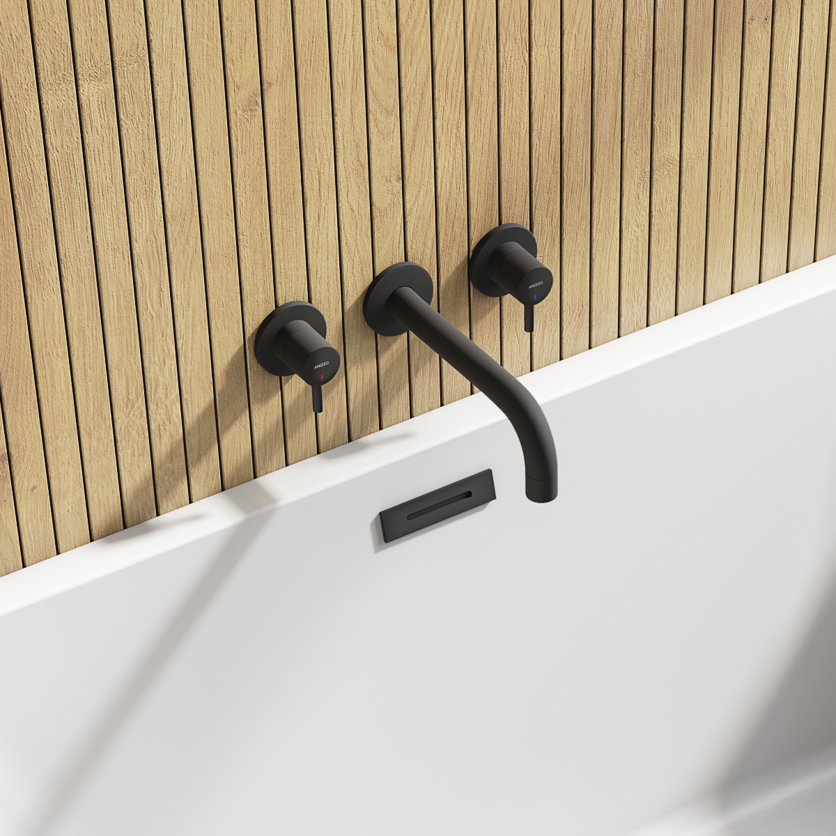 Add a splash of modernist style to your bathroom with our Arezzo fluted matt black range, features a decorative fluted texture around the sides of the tap head. This black wall-mounted bath tap with curved, round spout comes with stylish fluted textured tap heads. Crafted from solid brass, this matt black bathroom tap has a high-quality build and is easily installed in three tap holes. A black matt finish creates a sleek look for a striking contrast against traditional white fixtures and fittings.