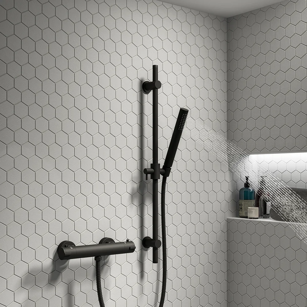 This stunning matt black Arezzo round bar shower valve is part of our range of contemporary collection of showers and valves. This modern bar valve features modern round styling with a matt black finish and has been constructed from solid brass. Features a pre-set maximum temperature that ensures that showering is safe and convenient. Supplied with decorative shrouds/covers to protect and conceal tile/wall edge, giving the installation a neat finished appearance. Pair the with a modern slider rail kit for a clean, and modern shower look.