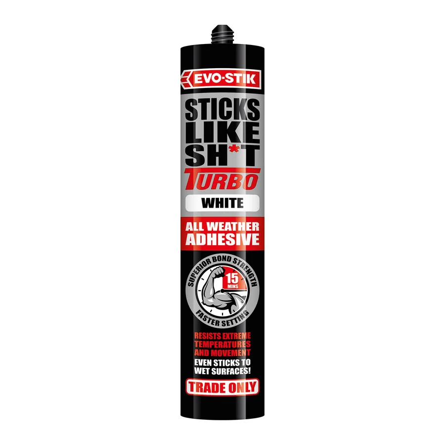 Evo-Stik Sticks Like Sh*t Turbo is a high quality grab adhesive based on a Silyl Modified Polymer that offers a high bond strength enabling instant grab. Evo-Stik Stick Like Sh*t Turbo is solvent free, vibration and shock resistant and UV and weather resistant. Its high strength enables heavy objects to be held immediately without support (up to 8kg after 15 minutes). Evo-Stik Sticks Like Sh*t Turbo is resistant to temperatures up to 100°C and as low as -40°C. It will even adhere to damp surfaces (but not saturated or running with water).