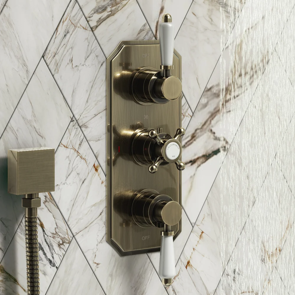 The Chatsworth 1928 antique brass concealed thermostatic shower system brings substantial elegance to the modern bathroom. The concealed triple shower valve offers thermostatic showering via three easy-to-operate controls. It operates two outlets separately or simultaneously. The concealed valve comes supplied with a matching wall-mounted antique brass 8-inch rose shower head and shower handset, slider rail kit, and hose. The classic style of this antique brass effect concealed shower valve adds a touch of sophistication and elegance to any bathroom. Manufactured using high-quality materials, our range of traditional shower valves will look outstanding in any bathroom.