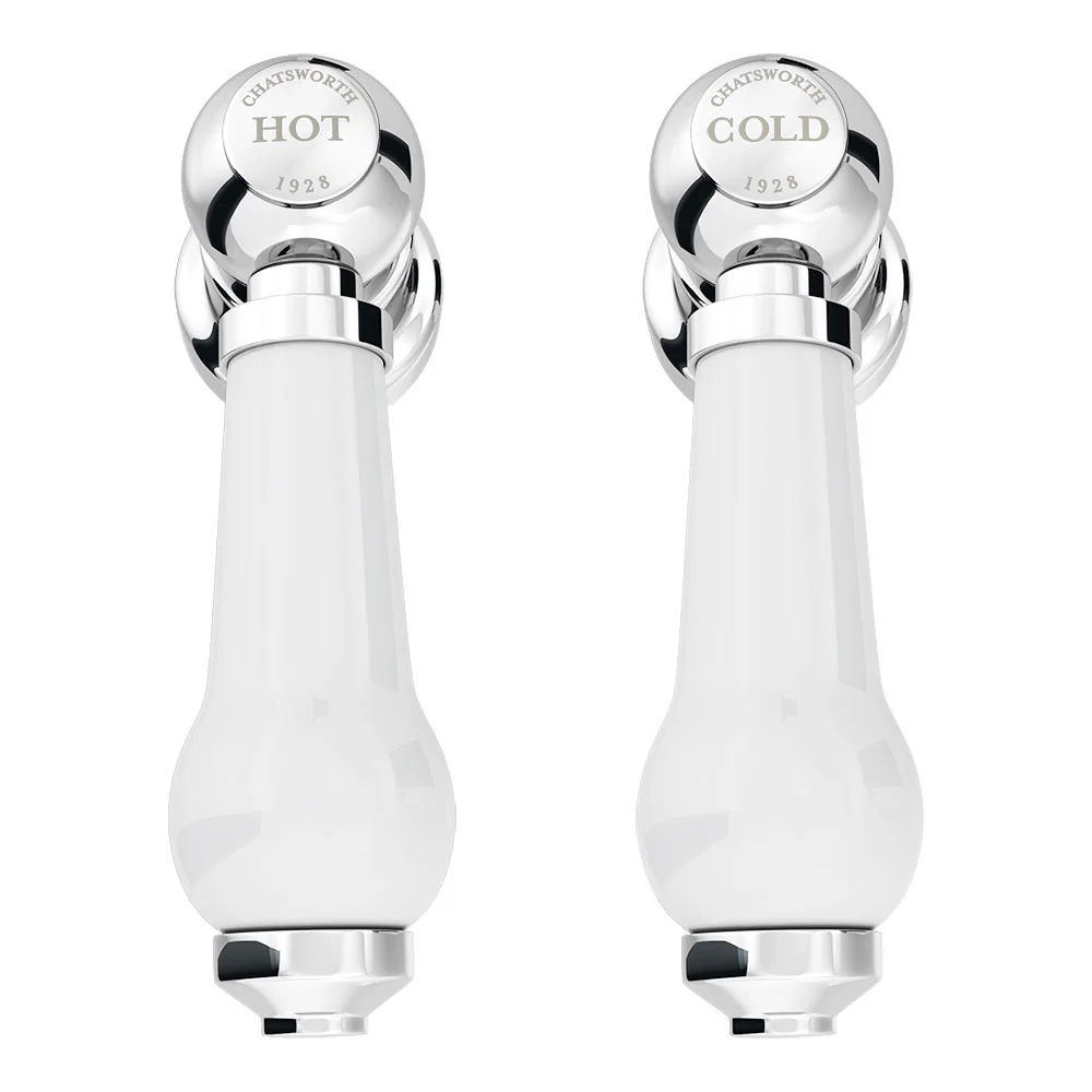 The traditional Chatsworth 1928 chrome three hole deck mounted basin tap with classically styled spout, create a traditional feel in your bathroom with this luxury basin mixer tap. Manufactured from brass with a polished chrome plated finish. Features decorative white lever handles with classic chrome indices to indicate the hot and cold controls. Transform any bathroom’s decor to the luxury and elegance of yesteryear.