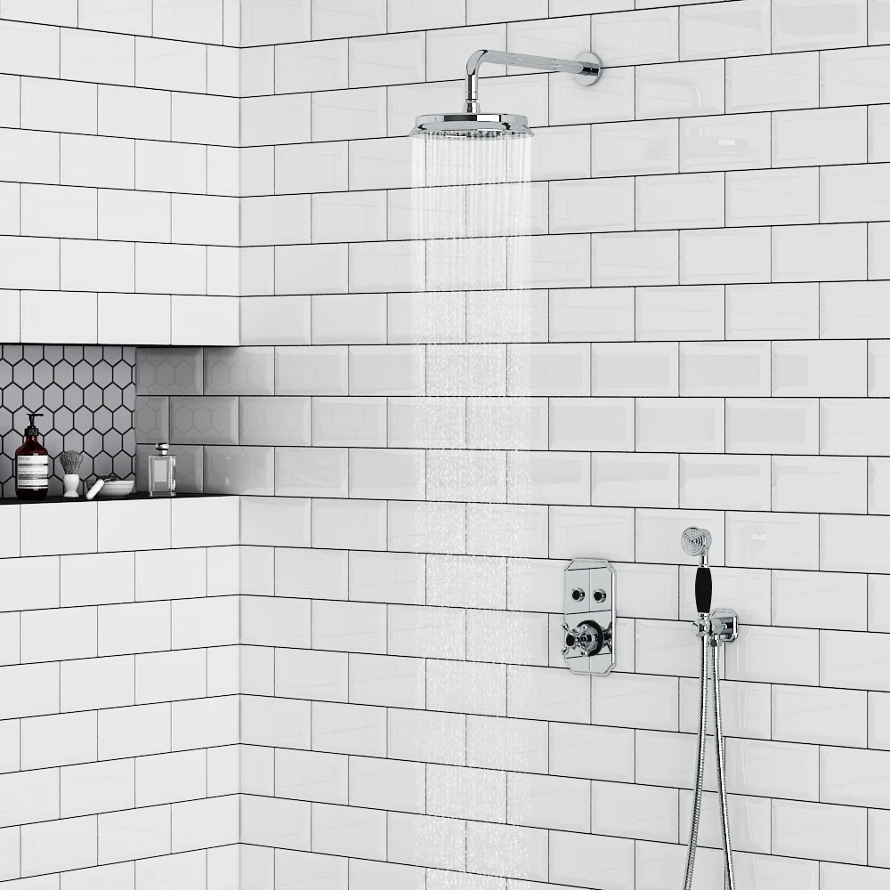 The Chatsworth 1928 two-outlet push-value shower valve, featuring stylish black controls, brings substantial elegance to the modern bathroom. This concealed shower valve offers thermostatic showering with simple push on/off flow controls, providing instant start/stop activation. Designed for use with two outlets, this shower valve is suitable for a single fixed head and slide rail kit, or a shower head and bath filler.