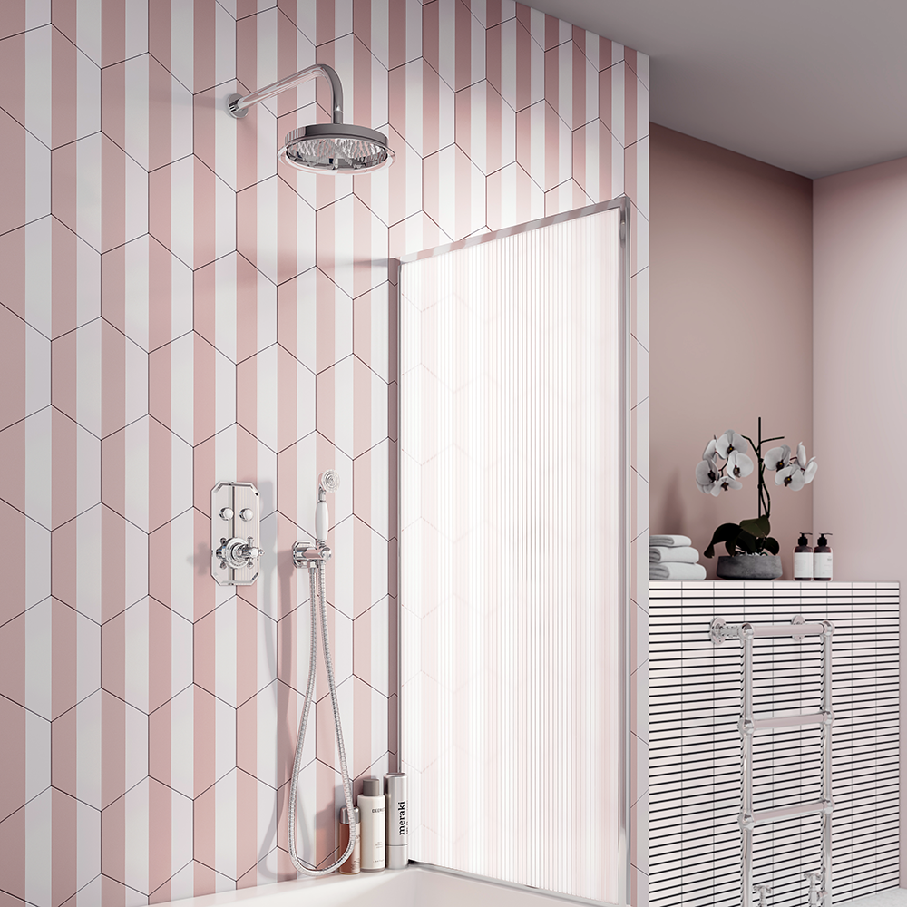 Take a relaxing shower at just the push of a value with the Chatsworth 1928 Traditional Shower Valve Pack. This traditional thermostatic shower has a concealed push value operated thermostatic valve for easy on and off functions. The pack also includes a rainfall shower head for a spa like experience and matching handset – both made from durable brass with a polished chrome finish. A gloss white ceramic section gives the handset a luxurious feel. Even better, you can hide the pipes behind the wall for a clutter free look.
