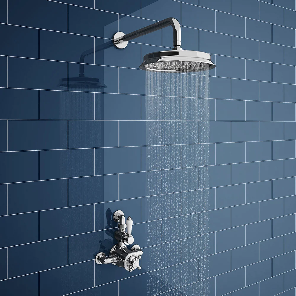 Introduce timeless elegance to your bathroom with the Chatsworth 1928 Traditional Twin Exposed Thermostatic Shower Valve, complete with a Return Elbow and Fixed 8″ AirTec Overhead Shower Head. This traditional twin exposed thermostatic shower valve pack, featuring a stylish ceramic control dial, offers thermostatic showering through two easy-to-operate controls. One control operates flow, while the other allows temperature selection.