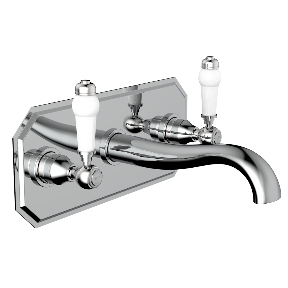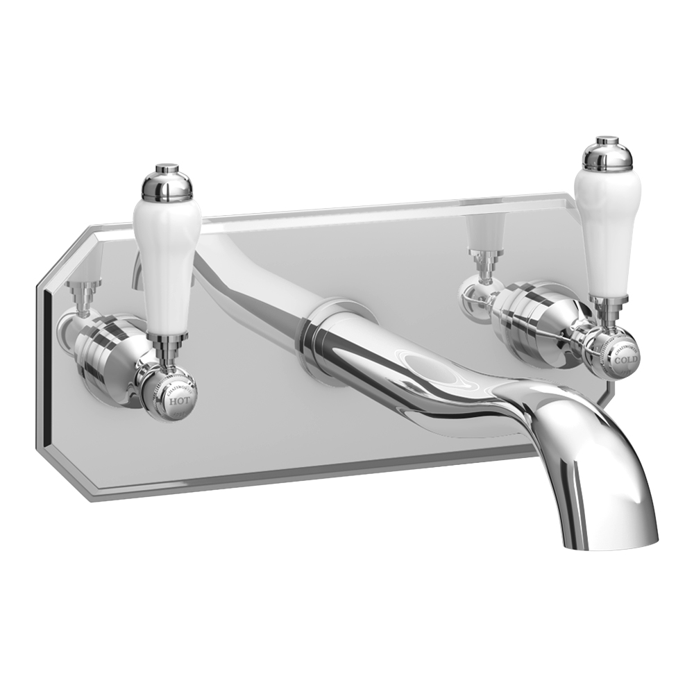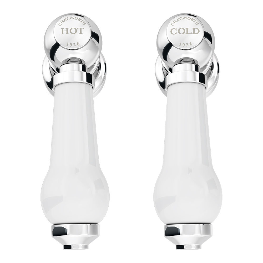 Add a touch of timeless elegance to your bathroom with the Chatsworth 1928 Wall Mounted White Lever Basin Mixer Tap. This beautifully crafted tap features classic lever handles for hot and cold water, made from sturdy brass with a polished chrome finish. The gently curved spout and decorative white ceramic lever handles enhance its heritage appeal.