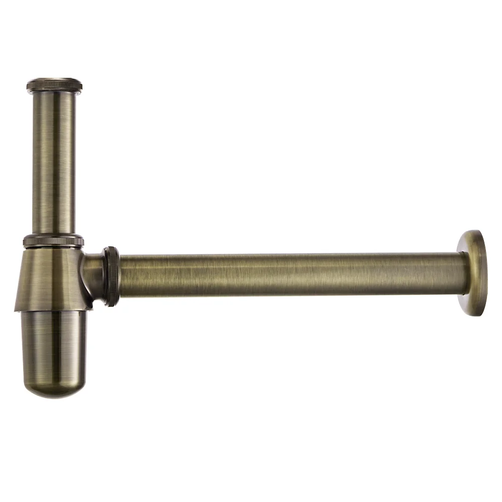 A traditional round shallow basin bottle trap in brushed antique brass with a wall pipe and a round wall flange. Perfect for giving a classic vintage look at a real value-for-money price. This traditional basin bottle trap will help keep your wash space clean and odour-free by stopping gases from rising up through the drainage system. Its height can be adjusted to fit, while its solid brass construction is durable for years of use. Combine it with one of our matching Chatsworth Antique Brass Taps (sold separately) for a perfectly harmonious traditional bathroom.