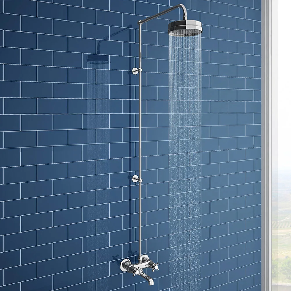 A traditional thermostatic shower featuring a classic circular design, the Chatsworth 2 outlet shower offers thermostatic showering via two easy-to-operate controls for temperature and flow. This elegant thermostatic exposed bar valve with riser kit will compliment any traditional bathroom suite. Features a luxurious rainfall shower head and bath spout.