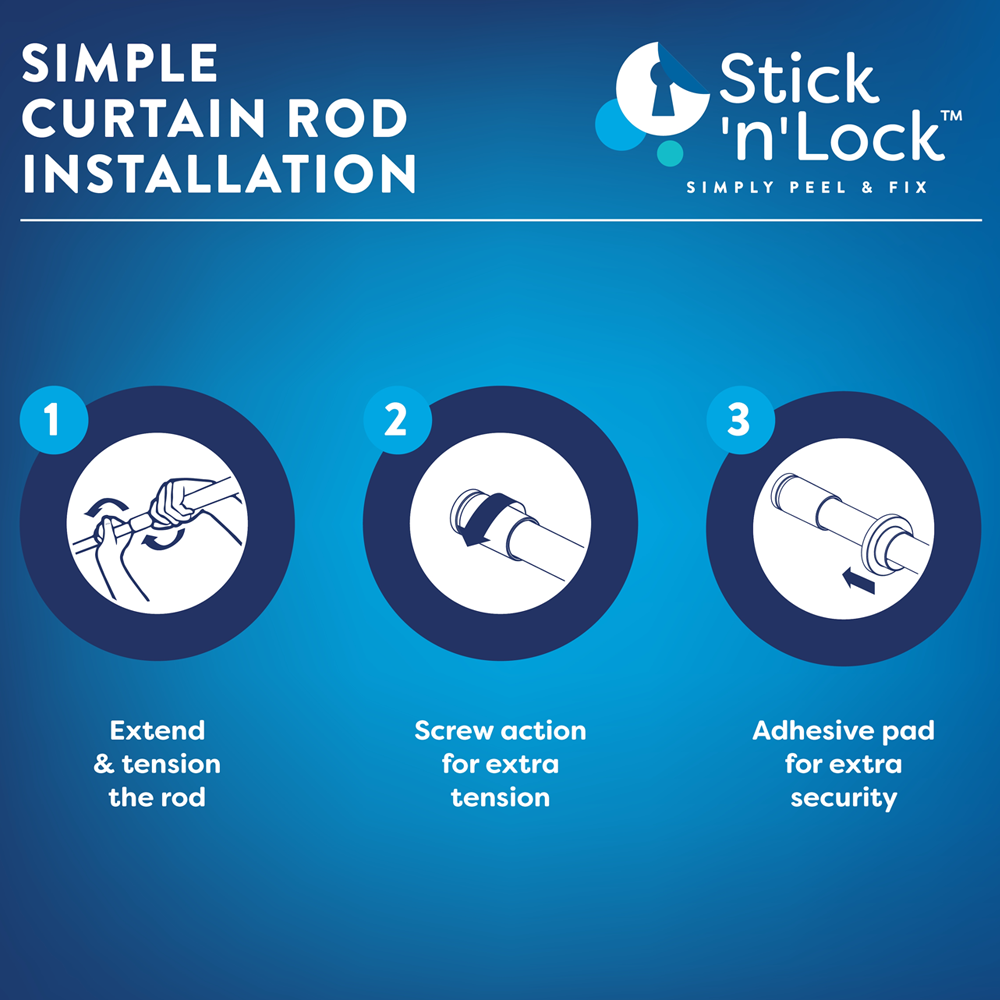 A quick refresh of your bathroom is hassle-free with Stick ‘n’ Lock. There’s no need to drill, simply stick the product where you want it, then put your feet up and relax. No stress, no mess, no fuss!. Perfect for tiled or painted walls, this contemporary rail holds curtains neatly in place. The smooth design also allows curtains to be pulled along easily, eliminating any chance of snagging or catching. Simple to install, a unique twist tension system and high-strength adhesive pad secure the rail into place. With no need to drill and its contemporary chrome finish, this modern rail can be used in any bathroom.