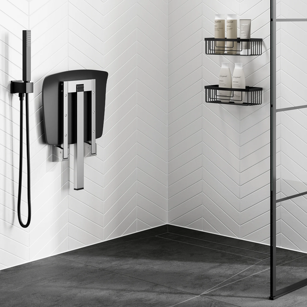 hib. shower seat with support leg offers a high quality solution with a desirable compact design for extra reassurance. The foldable system is also available in a white finish. Can be securely fixed to hold up to 23 stone (150kgs)