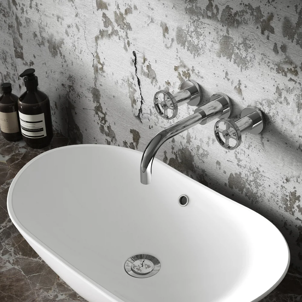 Give your bathroom an edgy, industrial vibe with the Hudson Reed Revolution 3TH Wall Mounted Basin Mixer. This solid brass design combines utilitarian-style wheel handles with minimal lines, and comes in a sleek polished chrome finish. With wall-mounted installation and a longer-than-usual spout reach, the Hudson Reed basin tap would be a great fit with larger insert or above-counter sinks that have no tap holes.