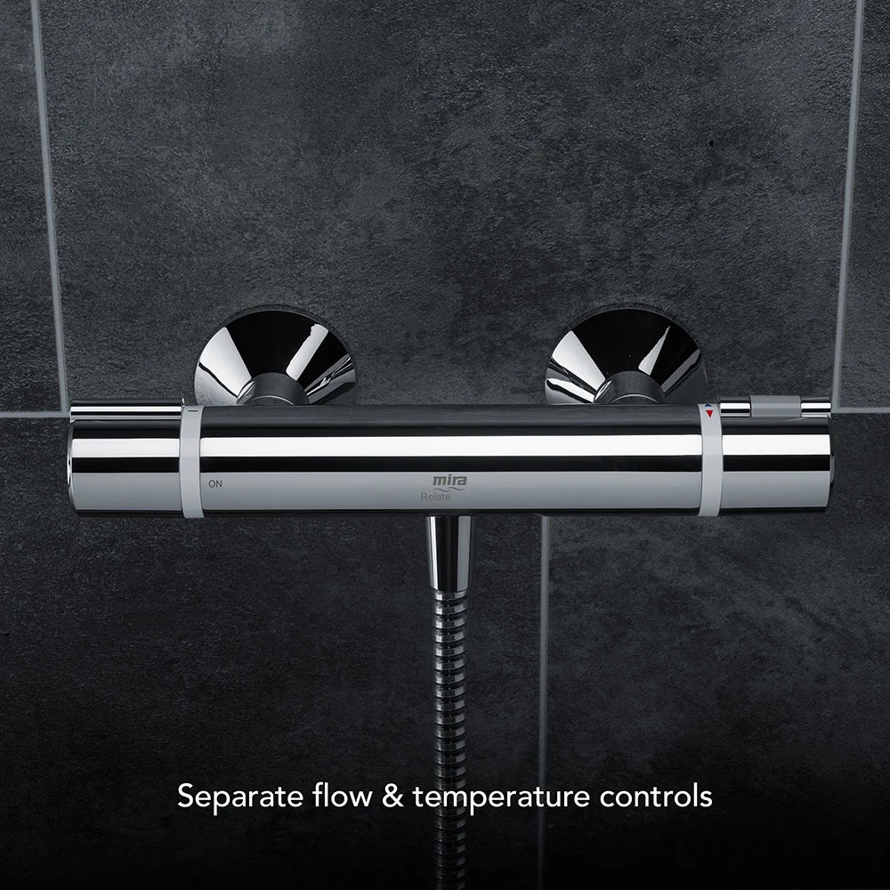 The modern Mira Relate EV Thermostatic Shower Mixer makes for a powerful showering experience. Mira’s clever Magni-flo™ technology gives up to three times more water flow, while the Cool Shield™ function stops the valve becoming too hot. Separate temperature and flow controls allow you extra control over your daily shower. This piece also boasts a single spray showerhead with rub clean nozzles for quick and easy limescale removal.