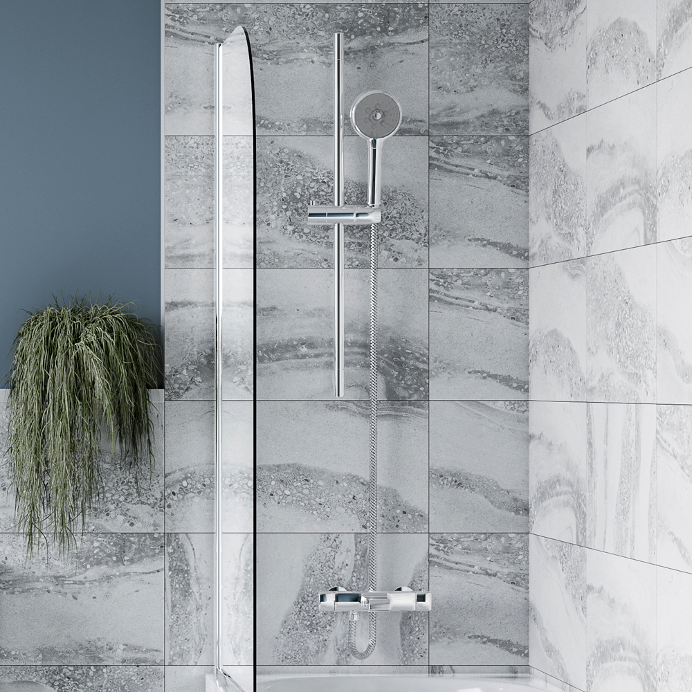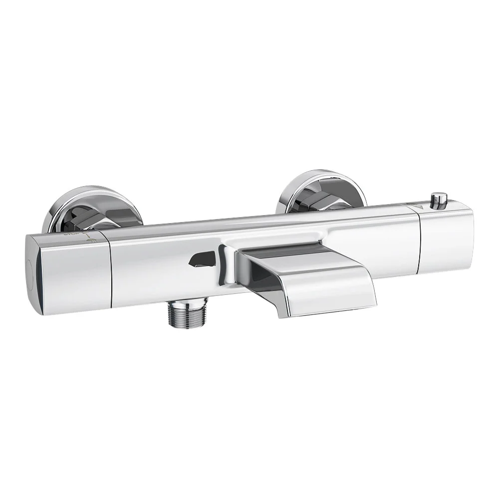 The modern, soft-curved Montreal bath shower mixer valve features an integrated wide bath spout and is designed for wall mounting. With thermostatic temperature control, users can precisely regulate water temperature via the bar valve.