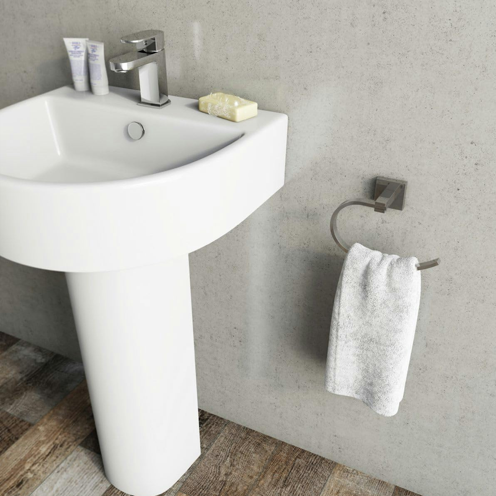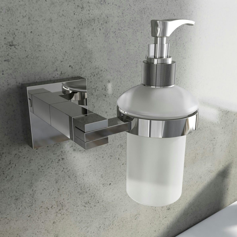 - Includes: Toilet Roll Holder, Towel Ring, and Frosted Glass Soap Dispenser