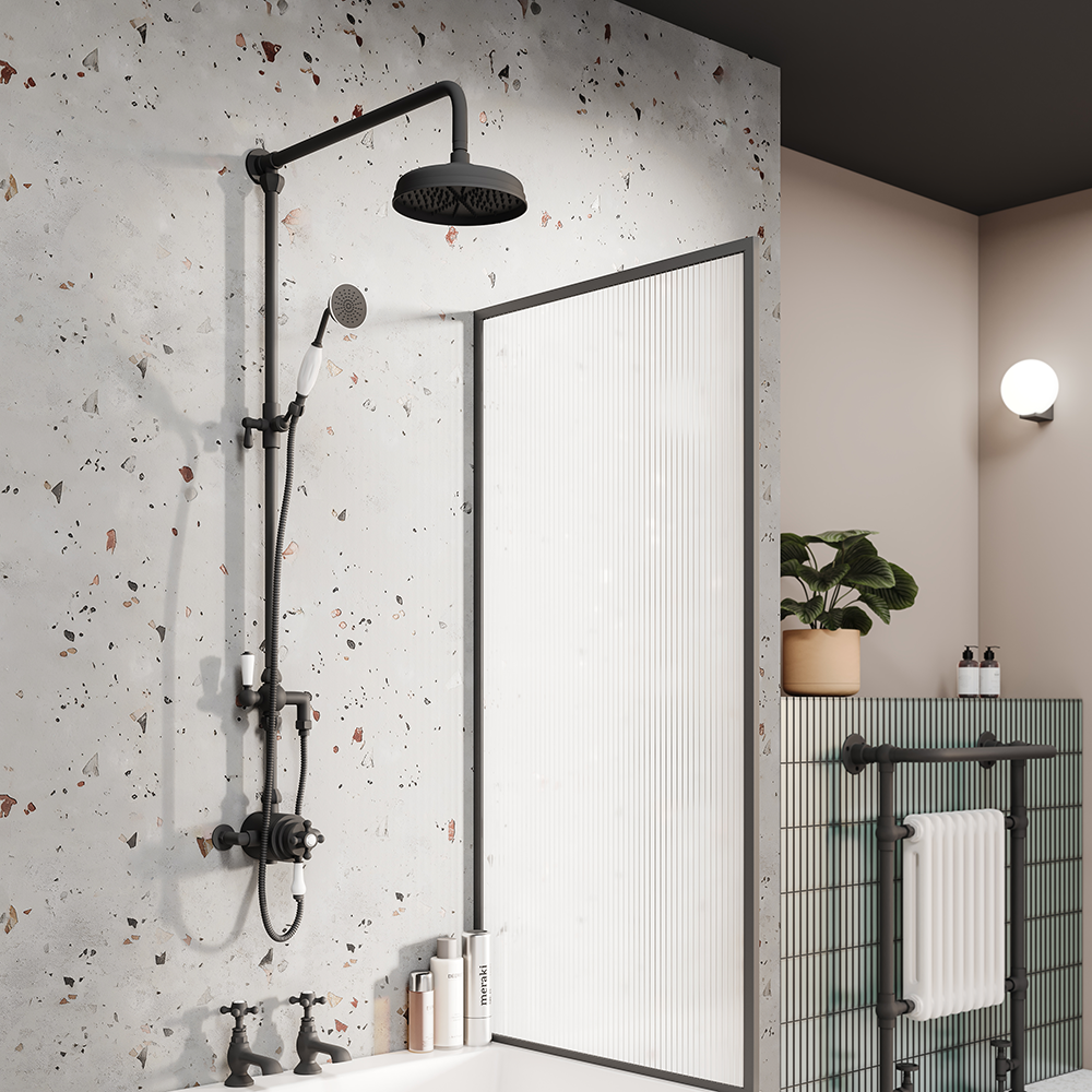 Trafalgar Traditional Rigid Riser with 200mm Round Apron Shower Head, Handshower, and Diverter in Matt Black